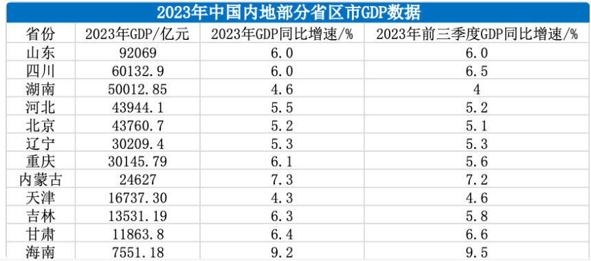 從GDP總量看,12個省份從高到低依次為山東(92069億元)、四川(60132.9億元)、湖南(50012.85億元)、河北(43944.1億元)、北京(43760.7億元)、遼寧(30209.4億元)、重慶(30145.79億元)、內蒙古(24627億元)、天津(16737.30億元)、吉林(13531.19億元)、甘肅(11863.8億元)、海南(7551.18億元)。