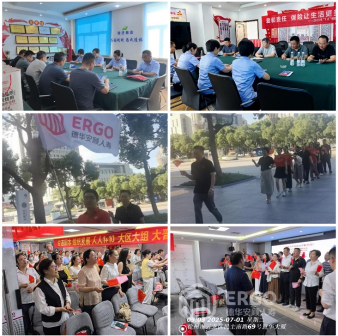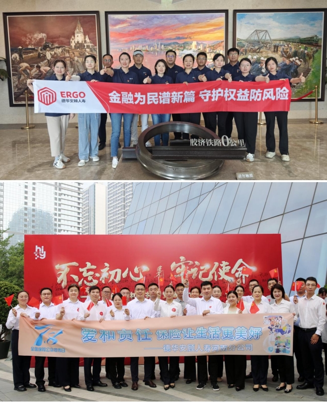 紅色引領(lǐng),開展紅色傳承群眾性宣傳活動。青島分公司結(jié)合“七一”,組織全員走進膠濟青島鐵路博物館,開展“賡續(xù)紅色血脈 賦能保險擔(dān)當(dāng)”教育活動。博物館內(nèi),員工通過歷史文物、影像資料及場景復(fù)原,深入了解膠濟鐵路百年發(fā)展歷程及背后的紅色革命精神,以沉浸式學(xué)習(xí)強化“服務(wù)國家戰(zhàn)略、守護民生福祉”的政治自覺,參觀結(jié)束后,員工隊伍從博物館徒步至青島棧橋,開展“環(huán)保健步+金融宣教”雙線行動,沿途手持清潔工具撿拾垃圾,以實際行動踐行綠色環(huán)保理念,同步向市民及游客發(fā)放反洗錢、反非法金融活動宣傳資料,將金融知識普及與城市文明建設(shè)深度融合,既展現(xiàn)了公司員工的社會責(zé)任感,又提升了公眾風(fēng)險防范意識;河南分公司組織黨員及員工參加海匯港“不忘初心 牢記使命”升旗儀式。全體人員不忘初心、牢記使命,全面貫徹落實黨的二十大及二十屆二中、三中全會精神,以實際行動展現(xiàn)擔(dān)當(dāng),助力公司前行;棗莊中心支公司聯(lián)合微山湖書畫院,舉辦了“‘翰墨頌黨恩 丹青繪華章’——慶七一迎勝利”書畫大賽暨7.8保險公眾宣傳日活動。通過藝術(shù)創(chuàng)作與保險知識普及相結(jié)合的形式,搭建了行業(yè)與社會公眾溝通的橋梁,展現(xiàn)了保險服務(wù)社會民生的責(zé)任擔(dān)當(dāng);徐州中支舉辦“紅歌嘹亮惠民生”主題活動,全體黨員領(lǐng)唱《沒有共產(chǎn)黨就沒有新中國》,同步設(shè)立“黨員先鋒服務(wù)臺”,為市民提供養(yǎng)老、健康險咨詢,推出“銀發(fā)無憂”專屬計劃,實現(xiàn)紅色教育與金融服務(wù)的深度交融;無錫中支在“七一”組織健步走活動,員工身著定制文化衫,以矯健步伐展現(xiàn)行業(yè)風(fēng)貌,傳遞愛黨愛國情懷;德華安顧人壽宿遷中支黨員干部帶頭走進鹽業(yè)公司,以典型案例解讀保險“守護愛與責(zé)任”的社會價值,推動企業(yè)管理層成為保險理念“傳播者”,深化黨建與金融服務(wù)的融合實踐。